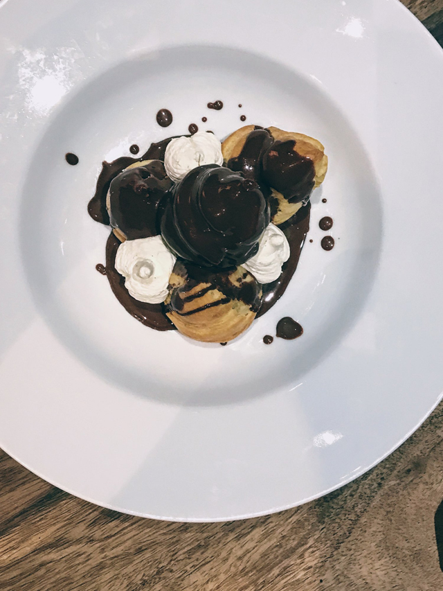 In the end we washed down all the sweet fat residue with a dark chocolate profiteroles (filled with ice cream rather than creme pattiserie) that both looked and tasted delicious.
