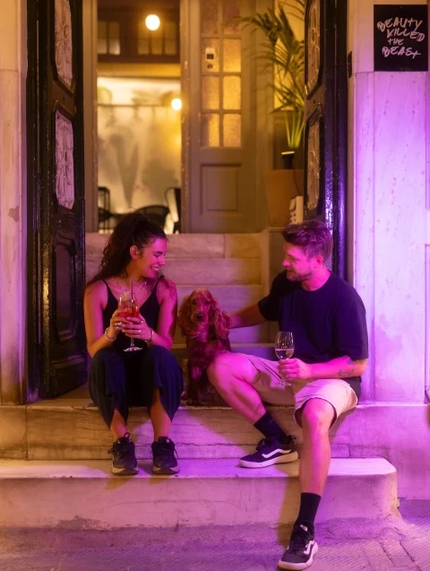 Just before the pedestrian street ends, we arrived at Beauty Killed the Beast, the first cocktail bar to land on Salaminos. Housed in an impressive neoclassical building with glass panels, plants, velvet textures, and details that feel more like an old house than a bar, by night it transforms into an atmospheric spot: low lighting, electronic and soul music (sometimes selected by one of the four co-owners, Myron Stratis), and tables full of people who stay until late. It’s no coincidence that it serves as the finale of the Salaminos stroll — a theatrical closing to a route that begins with pizza, street food, Italian dishes, and ends here, with a drink.
