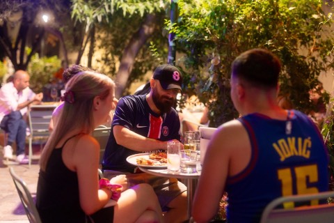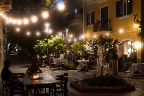 Visitors to Salaminos are split into two camps: those who vote for American comfort and line up at Steve’s, and the more “tradition loyalists,” who want thin, authentic Italian dough. The latter have their go-to spot just a few steps away — the tables of Armando. Armando serves exclusively Neapolitan pizza and fills the pedestrian lane every night — not only with hungry groups looking for a spot at the colorful tables, but also with Instagrammers who come to photograph the most photogenic pizza box in Athens, featuring the face of “Saint” Diego Armando Maradona (hence the pizzeria’s name). DJ Rodolfo plays music at full volume, glasses are filled with Aperol, and pizzas of every kind land on the tables — from the classic Margherita to the Spinata with pickled zucchini and kimchi, like the ones ordered by Vasso and Vivi, two girls we met by chance at Armando who love not only pizza but also the new hangouts that are springing up.