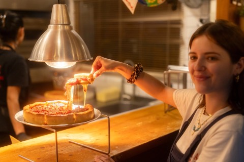 Steve’s made Salaminos synonymous with Chicago-style pizza. It’s housed in an old truck repair shop from the ’60s — underneath the kitchen there’s still the pit where mechanics used to stand to fix vehicles. The staff wear mechanic uniforms, the huge garage door reads “Manufacturing and assembly of hamburgers,” and the industrial retro aesthetic feels straight out of an American movie set.