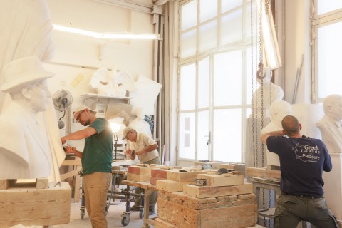 Today, Nikos’s sons, Alexandros and Thanasis—graduates of the Athens School of Fine Arts—continue the craft. Most young sculptors, they say, avoid marble because of its difficulty and the years of devotion it requires. But in an age obsessed with speed, they insist on a romantic, old-school approach: no electric tools, only hammer and chisel, with Praxiteles, Michelangelo, Chalepas, and Rodin as their references.