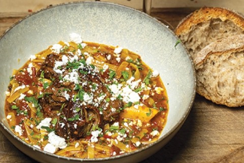 It continues with slow-cooked lamb shank—so tender it melts in your mouth—served with luscious hilopites in a rich sauce, the ultimate comfort dish. Or the equally flavorful pork shank, braised in beer, thyme, and honey, served with mushroom orzo and graviera cream. And there's more to come as winter rolls on…