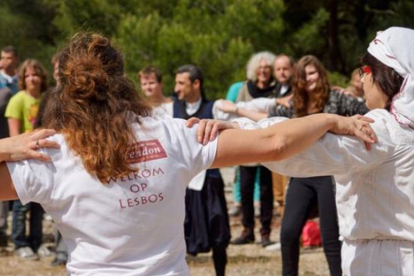 Police in Lesvos welcome tourists with ouzo and dance